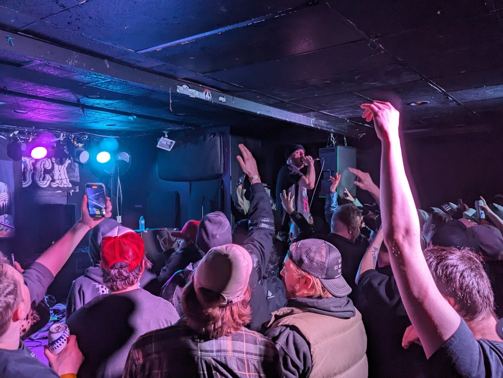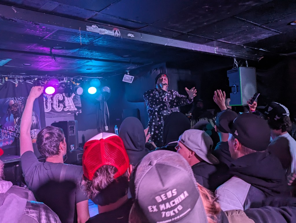 Rugged Man would hit the crowd with one more serious joint criticizing the government, performing his 2020 collab with Immortal Technique, “Who Do We Trust?,” getting the crowd to chant along to the hook before getting back to the party vibes. Looking to turn the crowd all the way up, the next few songs would be geared towards starting a mosh pit, starting with the 2013 classic “The People’s Champ.” While the decade-old throwback was hype, the next song might’ve been the most energetic of the entire night, my personal favourite off of All My Heroes Are Dead, “Dragon Fire.” Rugged Man would be quick to restart the song and really get the mosh pit going, wanting to show the footage to Ghostface Killah, who slays the opening verse to the Wu-Tang + Kool G Rap collaboration. It’s not often you see a mosh pit this wild happen in a small venue like Hard Luck Bar, but Rugged Man pulled it off, getting the crowd turned up as they let Ghostface Killah’s verse play before he killed his own verse and got everyone doing the “Wu-Tang!” chant.