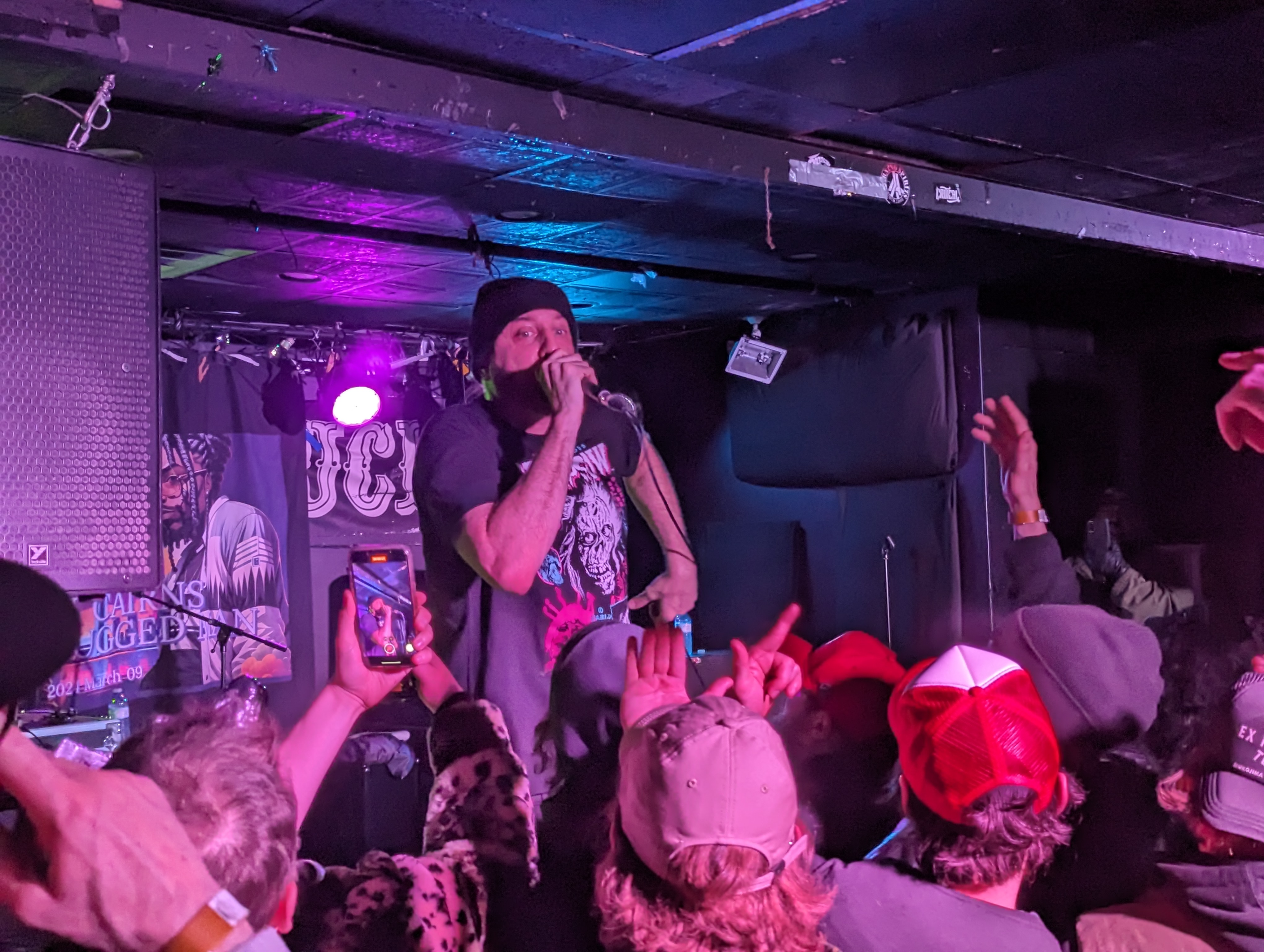 Rugged Man would hit the crowd with one more serious joint criticizing the government, performing his 2020 collab with Immortal Technique, “Who Do We Trust?,” getting the crowd to chant along to the hook before getting back to the party vibes. Looking to turn the crowd all the way up, the next few songs would be geared towards starting a mosh pit, starting with the 2013 classic “The People’s Champ.” While the decade-old throwback was hype, the next song might’ve been the most energetic of the entire night, my personal favourite off of All My Heroes Are Dead, “Dragon Fire.” Rugged Man would be quick to restart the song and really get the mosh pit going, wanting to show the footage to Ghostface Killah, who slays the opening verse to the Wu-Tang + Kool G Rap collaboration. It’s not often you see a mosh pit this wild happen in a small venue like Hard Luck Bar, but Rugged Man pulled it off, getting the crowd turned up as they let Ghostface Killah’s verse play before he killed his own verse and got everyone doing the “Wu-Tang!” chant.