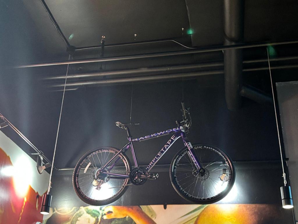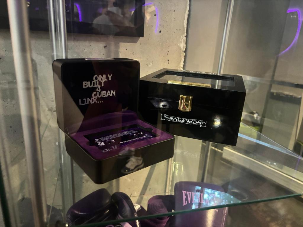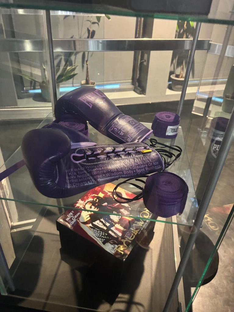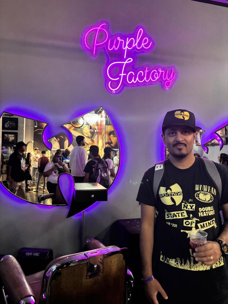 For anyone visiting The Purple Factory for the first time, it feels like immersing yourself in a Wu-Tang art exhibit. The walls are decked out in the album art from The Purple Tape itself, Only Built 4 Cuban Linx…, and there are art displays showcasing rare collectibles like the cassette box set, sneakers designed in the Cuban Linx colourway, and other album-themed sports gear including boxing gloves, bicycles and a basketball. Fans who signed up for the VIP event would get to sip on some tequila cocktails while admiring the look and feel of The Purple Factory, which had mirrors shaped like the Wu-Tang W logo for the barbershop chairs, and other fly imagery like a custom Raptors jersey with “The Purple Tape” written on the back, and gold and platinum album plaques hung up along the ceiling.