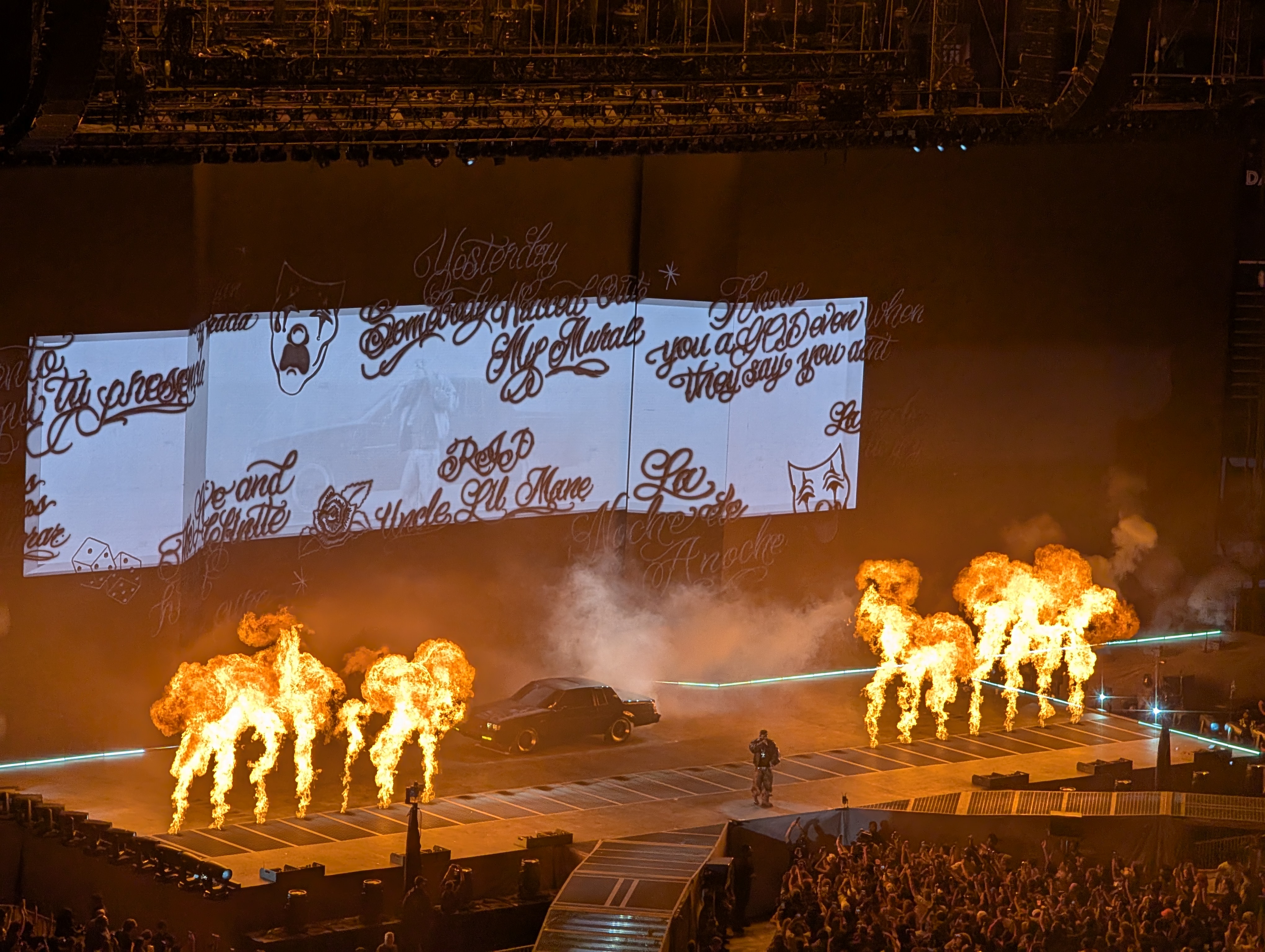 The lights would come on to reveal the Buick GNX being lifted again to the stage, now being covered in leaves, with the spotlight on SZA sitting on the hood of the car. She’d climb down to perform the Lana track “30 for 30” with Kendrick Lamar before taking over the stage with her own backup dancers, going into the throwback “Love Galore.” I’ll admit I wasn’t as familiar with SZA’s songs, not being much of an R&B head, but she had the ladies in the crowd grooving as she performed several throwbacks from her 2017 debut album, Ctrl, nailing her choreography on “Broken Clocks” and closing out her first set with “The Weekend.”