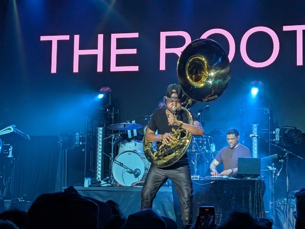The Roots are also known make the time for every band member to shine individually throughout the show. The band’s roster has changed many times over the years, with producer/drummer Questlove and emcee Black Thought being the consistent core, and they’d be joined by longtime members Kamal Gray on keys, Captain Kirk Douglas on guitar, and Tuba Gooding Jr. on sousaphone. More recent members also joining the band for this show included Mark Kelley on bass guitar, Stro Elliot on MPC/percussion, Raymond Angry on a second keyboard set, Ian Hendrickson-Smith on saxophone, and Dave Guy on trumpet. The first to get a solo would be Dave, as he’d let loose on the trumpet as the band played an instrumental to back him, eventually turning into a cover of the 1975 Jazz record “Think Twice” by Donald Byrd.
