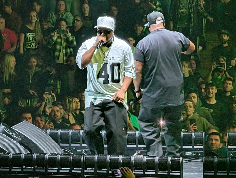 Cube and WC would go all the way in on a Westside Connection segment, returning to the front of the stage and getting the crowd to join in on the chant as they pulled out the deep album cut “The Gangsta, The Killa And The Dope Dealer.” Cube would rock his verse at the front of the stage, and WC, known to bust a dope crip walk on stage, looked like he was gliding down the platform as a conveyer belt moved him to where Cube was standing. From there, the platform at the edge of the stage lifted both Ice Cube and WC into the air as they got the whole building moving to their 2003 classic “Gangsta Nation,” another Nate Dogg hook getting the energy turned all the way up. They would next pull out a rare cut off of Ice Cube’s 2010 album I Am The West, another high-energy banger “I Rep That West,” and that was a signal to fans that we were moving into another era of Hip-Hop.